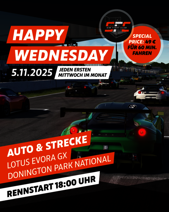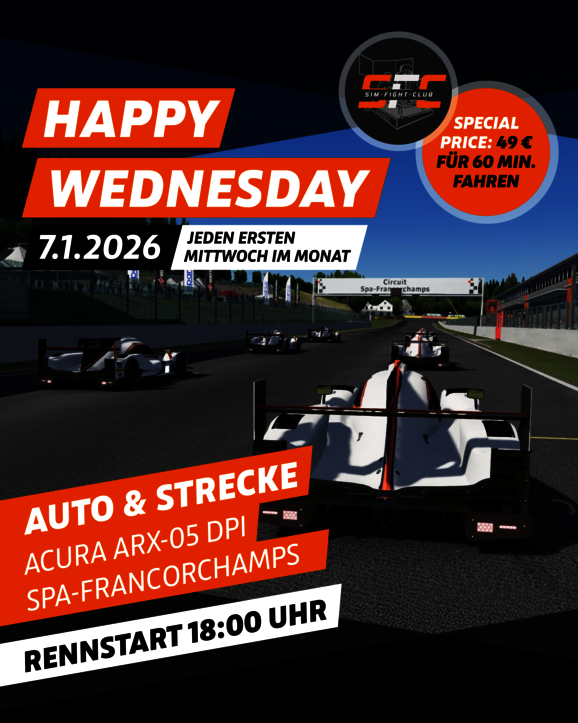 Jeden ersten Mittwoch im Monat heißt es bei uns: Ready, Set, Race! Mit dem ABA Happy Wednesday Sim-Fight-Club veranstaltet AbA ein offenes Rennen – ideal für alle, die sich mit anderen Fahrerinnen und Fahrern aus ganz Deutschland messen möchten. Alle aus SimRacing-Centern mit gleichen Voraussetzungen!
